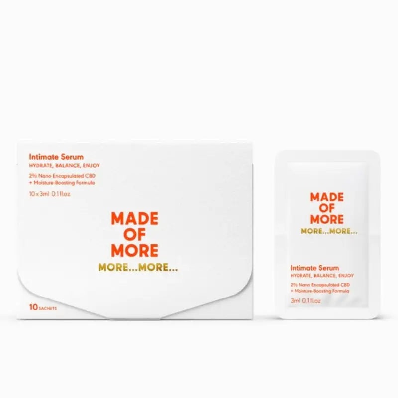 Our Intimate Serum is made for more fun. And the serious bit? It’s a pH-balanced water-based formula with nano CBD, moisture-boosting vegetable glycerin and prebiotics for intimate hydration, balance and maximum sensory benefit. By enhancing sensory pleasure and helping dryness, we hope to support women who want MORE from their sex lives, overall comfort day to day, but above all, to feel as though its not the end. Housed in 10 easy-to-use single-use sachets. Perfect for when youre on the go; simply snap open with one hand, leaving the other free wherever its needed