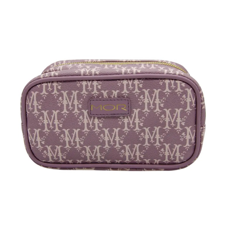 The pouch is adorned with elegant gold hardware zip closures, each intricately engraved with the MOR logo, adding a touch of luxury. The lilac faux leather exterior, embossed with a heritage-inspired monogrammed pattern, exudes sophistication and style, making the MOR Florence Pouch a fashionable and practical choice for anyone looking to keep their essentials elegantly contained.