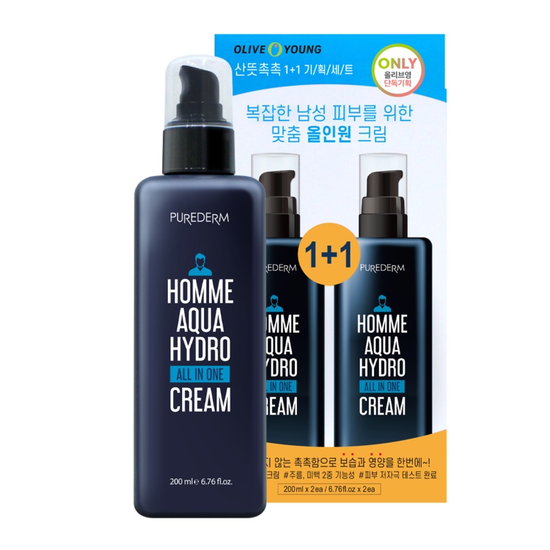 PRRETI [Purederm] Homme Aqua Hydro All-in-One Cream 200ml (2 Pieces)DescriptionA complete skincare solution in one; this 2pack of mens allinone cream combines toner, balm, serum, day & night cream. This lightweight gelcream deeply hydrates, balances oil, a