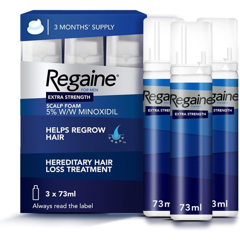 REGAINE Extra Strength Foam 5% is used to treat hereditary hair loss in men. The medication contains an active ingredient, which aids blood flow to the hair follicles of the scalp to increase the follicle size and hair shaft diameter. This prevents further hair loss and promotes hair regrowth.